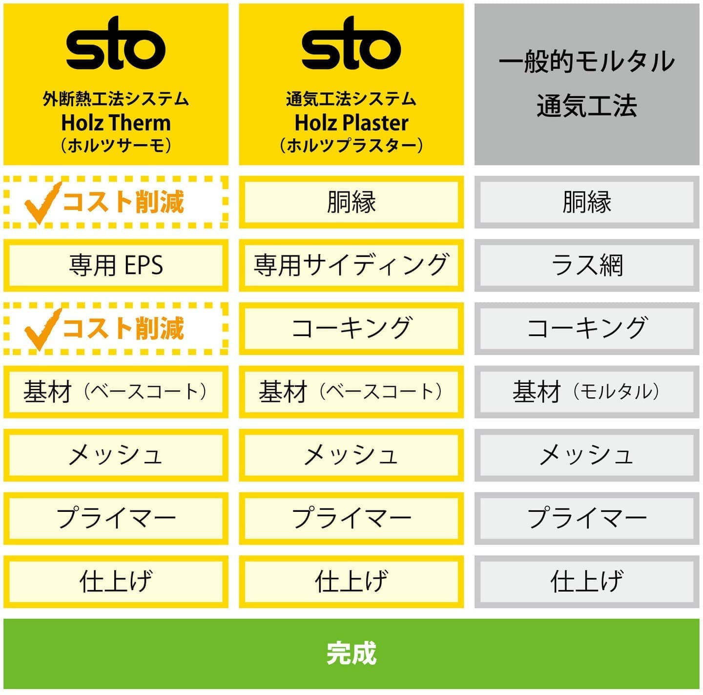 他の工法と比較して「胴縁」,「コーキング」工程を節約することが可能です.材料費の面で大差のなかった別工法のホルツプラスターですが,工事面では施工面積の増加に比例してコストの差が開き,大規模な面積になる程ホルツサーモが割安となる結果となります.