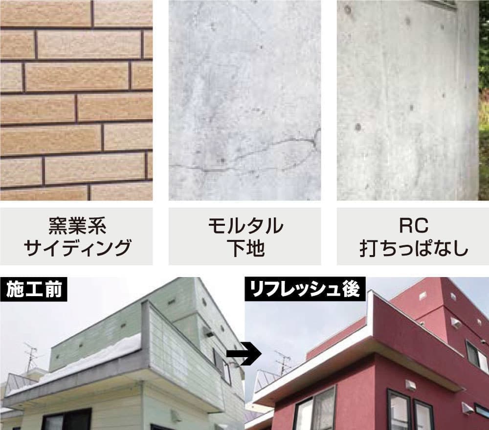 既存の外壁を撤去することなく,ベースコートとメッシュで補強し,温かみのある左官仕上げができます.そのため,ゴミを出すことなく外壁リフレッシュが可能です.対応可能な外壁の種類は,窯業系サイディングやRC打ちっ放し,モルタル下地などがあります.(既存の状況により、施工できない場合もあります.)