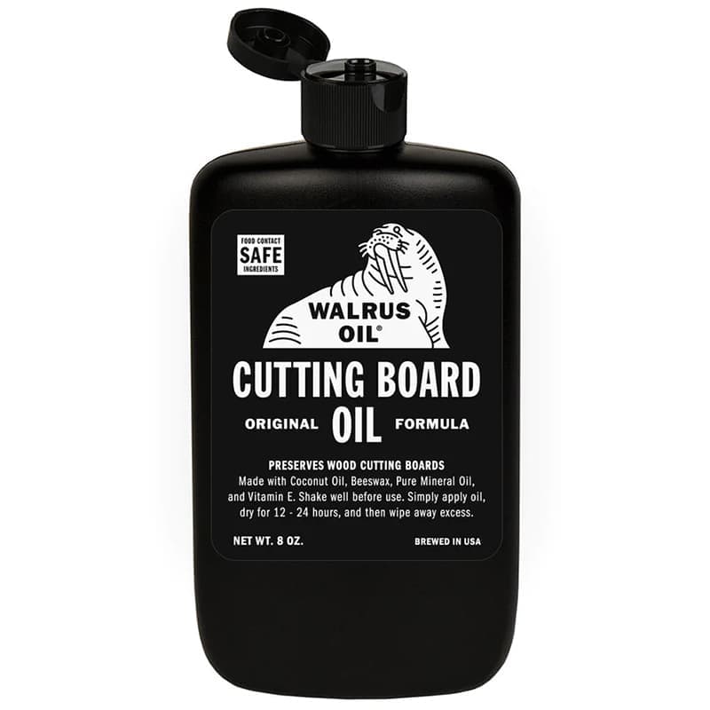 どんなに良い物でも、木製のまな板を長持ちさせるには適切なメンテナンスが必要です。定期的な処理を行わないと、乾燥したり、ひび割れたり、表面にカビが生えたりすることさえあります。ウォルラスオイルのカッティングボードオイルは木材保存油で木材の表面に浸透し、水をはじく蜜蝋で表面をコーティングし、まな板が何世代にもわたって長持ちするのを助けます。